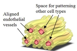 Alternatively, scientists have attempted to direct the distribution of newly formed vessels via three-dimensional (3D) co-patterning of endothelial cells with other cell types in a hydrogel. This approach allows large concentrations of endothelial cells to be positioned in specific regions within the tissue, leaving the rest of the construct available for other cell types. The hydrogel also acts as a reservoir of nutrients for the encapsulated cells. However, co-patterning multiple cell types within a hydrogel is not easy. Conventional techniques, such as micromolding and organ printing, are limited by slow cell assembly, large volumes of cell suspension, complicated multi-step processes and expensive instruments. These factors also make it difficult to scale up the production of implantable 3D cell-patterned constructs. To date, these approaches have been unsuccessful in achieving vascularization and mass transport through thick engineered tissues.