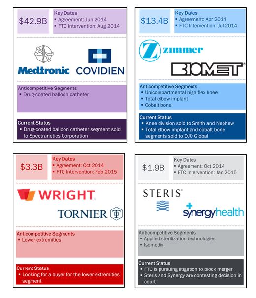 The four deals shown in Figure 1 typify the FTC’s policy shift toward anticompetitive mergers and acquisitions. All four mergers represent large medical device deals valued at over $1 billion. In all four cases, the FTC intervened after the deal had been publicly announced to all stakeholders. The FTC also only targeted segments that had few additional players, and those segments in which the combined company held a very large share, as being anticompetitive to the market: