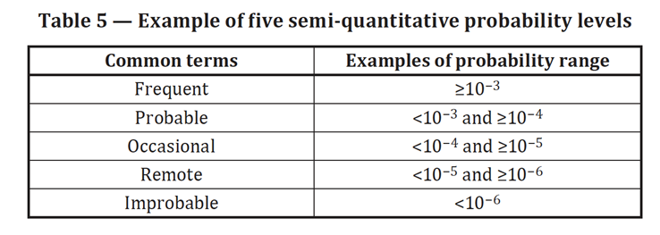 Furthermore, it is common for organizations to not only use the probability terms but also their associated ranges as described in ISO/TR 24971:2020 below.