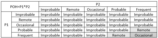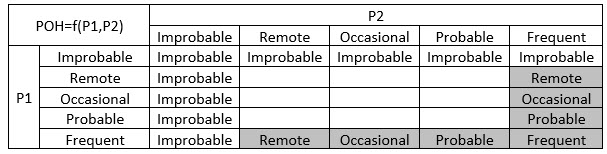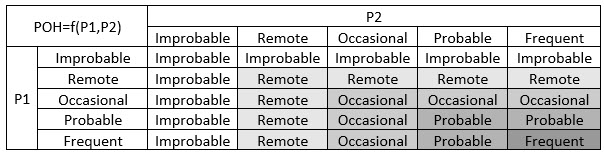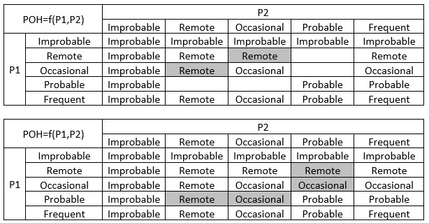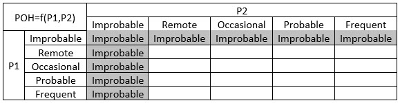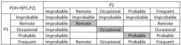 This POH is not generated mathematically but logically. This POH tilts toward lower probabilities when a higher and lower probability are considered; for example, a POH of Occasional results when a P1 of Probable and a P2 of Occasional interact. When both P1 and P2 are the same category, POH is the same as P1 and P2. And, in general, as probabilities P1 and P2 increase from left to right or up to down, the POH increases.