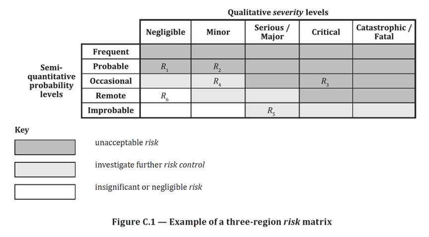 It is commonplace for organizations to closely follow the process and examples in the standards, even though they are not compulsory. Several ways organizations follow the standards are in the risk matrix, aka risk scoring, and the severity and probability categories. The majority of organizations have implemented the 5x5 risk scoring table with the five severity categories and the five probability categories as shown here (Ref ISO/TR 24971:2020 Figure C.1). Note: Organizations need to set risk evaluation criteria but do not have to set it as shown here.