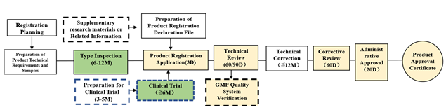 - Boxes shaded in yellow are under NMPA. The technical review period for the registration of imported class 2 medical devices is 60 working days. The technical review period for the registration of imported class 3 medical devices is 90 working days.