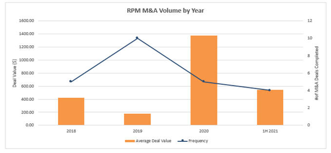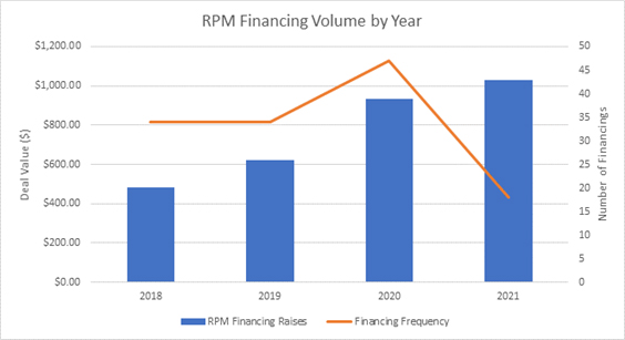 RPM related IPOs (Figure 2) have demonstrated a steady uptick, with an enormous surge during the pandemic; partial year 2021 data show even further growth and activity. Amount financed and the frequency of IPOs are both trending up significantly, and both trends reflect the market dynamics and clinical evolution noted above.