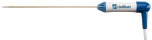 The UniBlate features a single, 17 gauge cannula electrode with a scalable active tip length of 1 to 2.5 centimeters. This novel feature allows the physician to perform multiple ablations with the same electrode; the physician can adjust the length of the active electrode to ablate areas between 1 and 3 centimeters in length and 1 and 2.5 centimeters in diameter, reducing the need to switch electrodes during a multiple ablation procedure. In turn, this minimizes a hospital's need to maintain an inventory of single electrode RF needles of varying sizes.