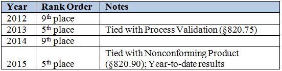 One measure of this problem’s magnitude is its relative frequency of occurrence in FDA warning letters. These often cite multiple problems with a company’s QMS, but an analysis can count the number of times “§820.22 Quality Audit” is cited. The table below shows the rank order for recent years.