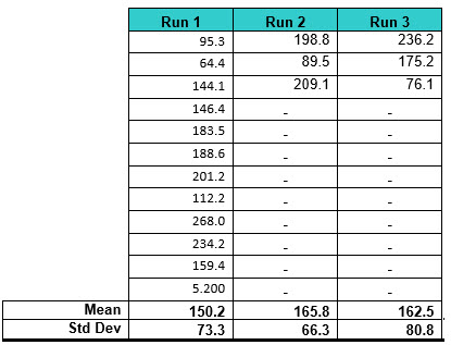 Table 3: Random TOC Swab Data Used for Simulation 2. Twelve data points were generated for the first run and three data points for the second and third runs.