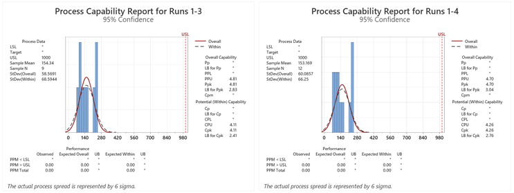 Figure 1: Process Capability Report for Runs 1–4. Note: Results were added to each run from the previous run(s).
