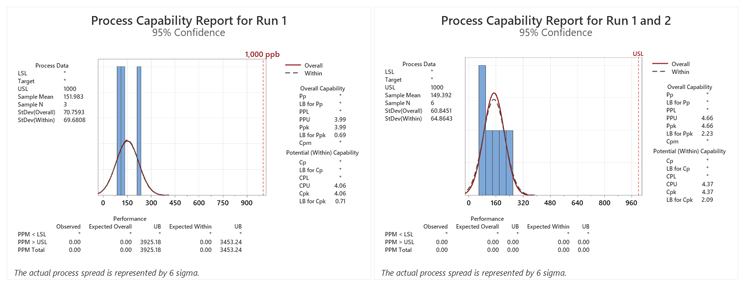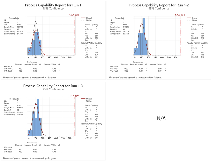 Figure 3: Process Capability Report for Runs 1–3. Note: Results were added to each run from the previous run(s).