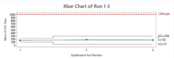 Figure 4: Control Chart of Runs 1 Through 3. The data points plotted are the means of the data collected from each run. As we know from the central limit theorem, these means are equal to the means of the total sample population. From this, we know that the TOC values of all sample sites are well below the acceptance limit of 1,000 ppm of TOC.