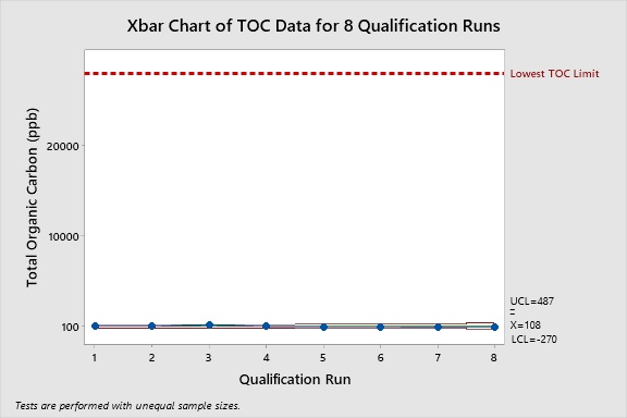 The collected the TOC swab data were also plotted using an Xbar Control Chart. This analysis of data also demonstrates that the product residues for the hardest-to-clean products were consistently controlled well below the lowest TOC limit. The upper control limit (UCL) for all of the TOC swab data was only 487 ppb, meaning that 99.87% of all the TOC swab data fell below this value.