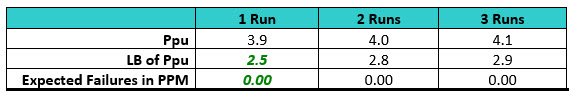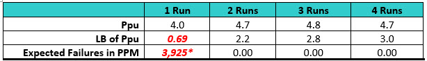 After a second qualification run was performed, the Six Sigma criterion was met for both the Ppu and LB and the number of expected failures at the LB fell to 0.00 PPM. Third and fourth qualification runs did not significantly improve the Ppu at this LB. In this simulation it appears that a minimum of two runs may be necessary, which could also be a sufficient number of runs with the sample sizes used.
