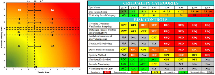 Figure 8: Shirokizawa Diagram for Selecting Criticality6 and E3470 Suggested Risk Controls.7 The Shirokizawa matrix with eight categories (1A – 4B) based on the toxicity score of the compound and the Cpu score of the cleaning process. The black dot (●) marks the intersection of the toxicity and process capability data for the cleaning process of this topical pharmaceutical facility. The location in the 4B/4A quadrant made this facility a strong candidate for replacement of swab sampling with visual inspection as per ASTM E3470.