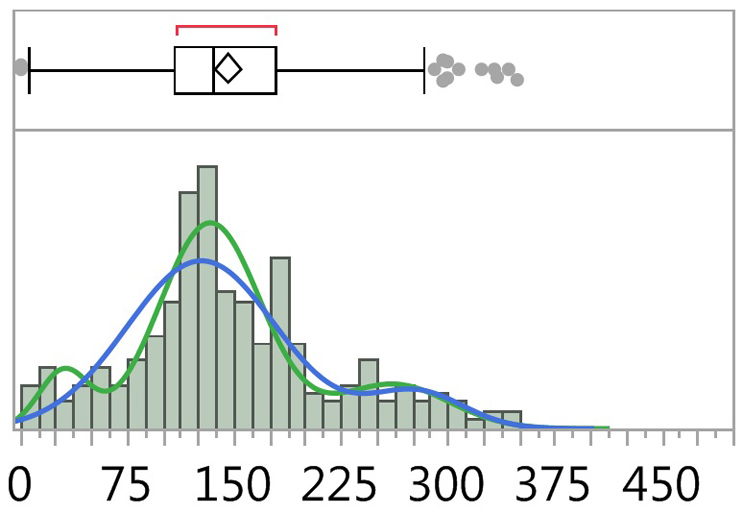 Figure 9: Fitted Normal 2 and 3 Mixture Plots of TOC Data.3 The graph above shows a combination box plot (top) and histogram (bottom) of TOC data from reference 3. Fitted line plots for two mixtures and three mixtures are shown superimposed on the histogram and indicate the possible presence of three normal distributions within the data set (green plot). See reference 3 for a detailed discussion about this data analysis.