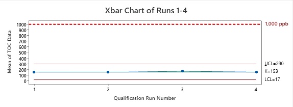 Figure 2: Control Chart of Runs 1 Through 4. The data points plotted are the means of the data collected from each run. As we know from the central limit theorem,1 these means are equal to the means of the total sample population. From this, we know that the TOC values of all samples are below the acceptance limit of 1,000 ppb of TOC.