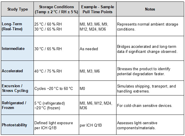 Stability programs may combine multiple study types depending on the study intent, shelf life determination goals, and device characteristics:
