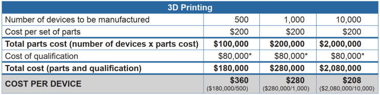 Let’s walk through a real-world example, looking at the cost to produce a single-use sterile articulating cardiac catheter device. You can see that even when adding in the cost of tooling, the cost per unit is still lower with injection molding than it is with 3D printing – and decreases dramatically at higher volumes.