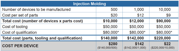 - Production cost. Rapid prototyping is fast and relatively inexpensive for 10, 20, or even 100 units. But for most parts or devices, once you move into volumes of a few hundred or more, it becomes uneconomical. On the other hand, with injection molding, the initial investment for the molds can be high. Once made, though, molding becomes significantly more cost-effective.