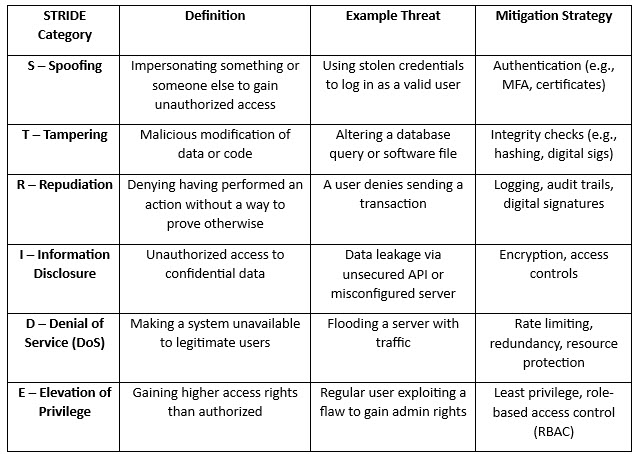 Once the DFD is completed, risks need to be identified at minimum at every interface and, at most, at every element. This can be done a variety of ways, and I recommend using STRIDE, which is elaborated in Table 1.