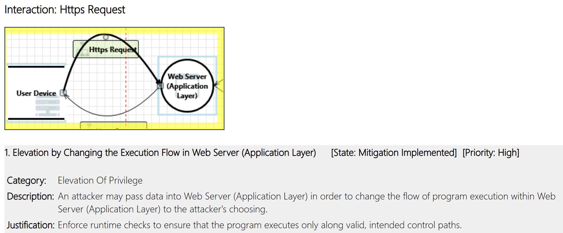 The threat modeling exercise should provide a good set of initial risk controls. In the threat model in Figure 2, let’s analyze the interaction of “HTTPS request.” A sample output of Microsoft Threat Modeler can be as shown in Figure 3.