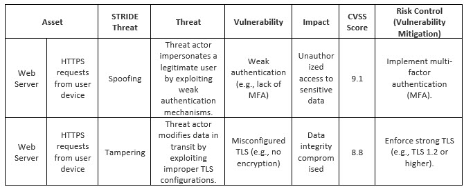 Table 2 shows a basic cybersecurity risk assessment that brings all the elements we discussed together. It easily accepts input from the threat model and lends itself to CVSS scoring for prioritization. Depending on the context of operation, additional fields can be added onto this assessment, such as residual score, environmental score, causes, verification of implementation and effectiveness, etc.