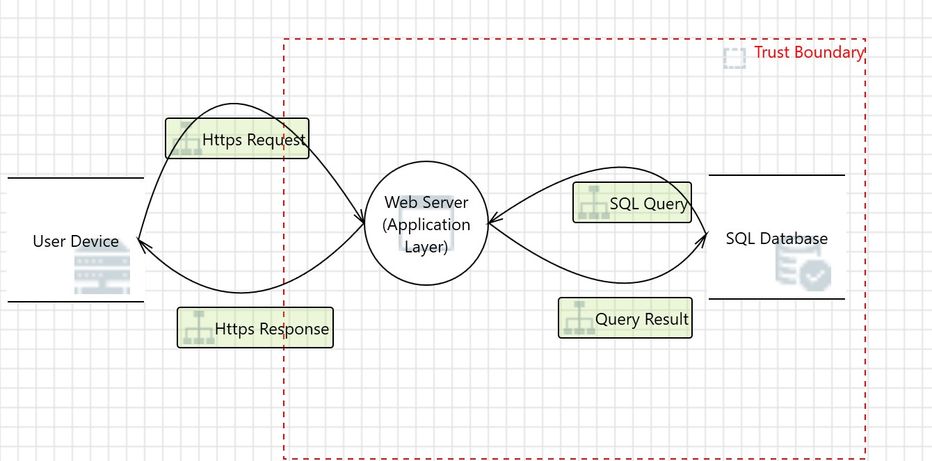 This data flow diagram (DFD) in Figure 2 illustrates a basic web application architecture where a user device communicates with a web server via secure HTTPS requests and responses. The web server processes the request, interacts with an internal SQL database through SQL queries, and returns the query result to the user. A red dashed "Trust Boundary" separates external (untrusted) components, like the user device, from internal (trusted) components, such as the web server and database. This boundary highlights the critical interface where cybersecurity risks—such as injection attacks, spoofing, and unauthorized access — must be mitigated through proper controls like encryption, input validation, and authentication.