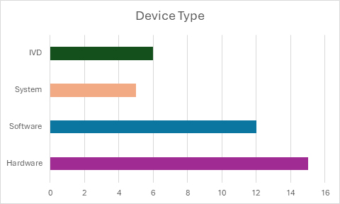 The types of devices covered by PCCPs include hardware, software, systems (i.e., devices including hardware and firmware/software), and in vitro diagnostics (IVD). The analysis shows: