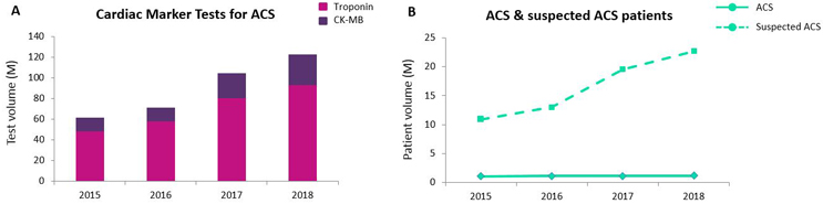 Fig. 2 — (A) Number of troponin and Creatine Kinase - Myocardial Band (CK-MB) tests sold in the US (B) Number of acute coronary syndrome (ACS) and suspected ACS patients tested using cardiac marker tests in the US