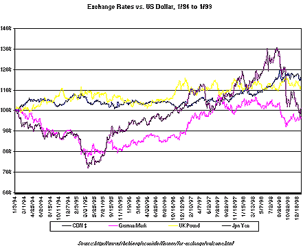 Currency fluctuations directly impact a company's earnings from overseas sales. Since most international sales are made in local currencies, the resulting U.S. Dollar revenues will rise and fall with the exchange rate. If stable currencies fluctuate this wildly think about how unpredictable the revenue stream from smaller markets will be!Foreignexchange Translations, Inc.ter>Back to ContentsForeignexchange Translations, Inc.ter>
