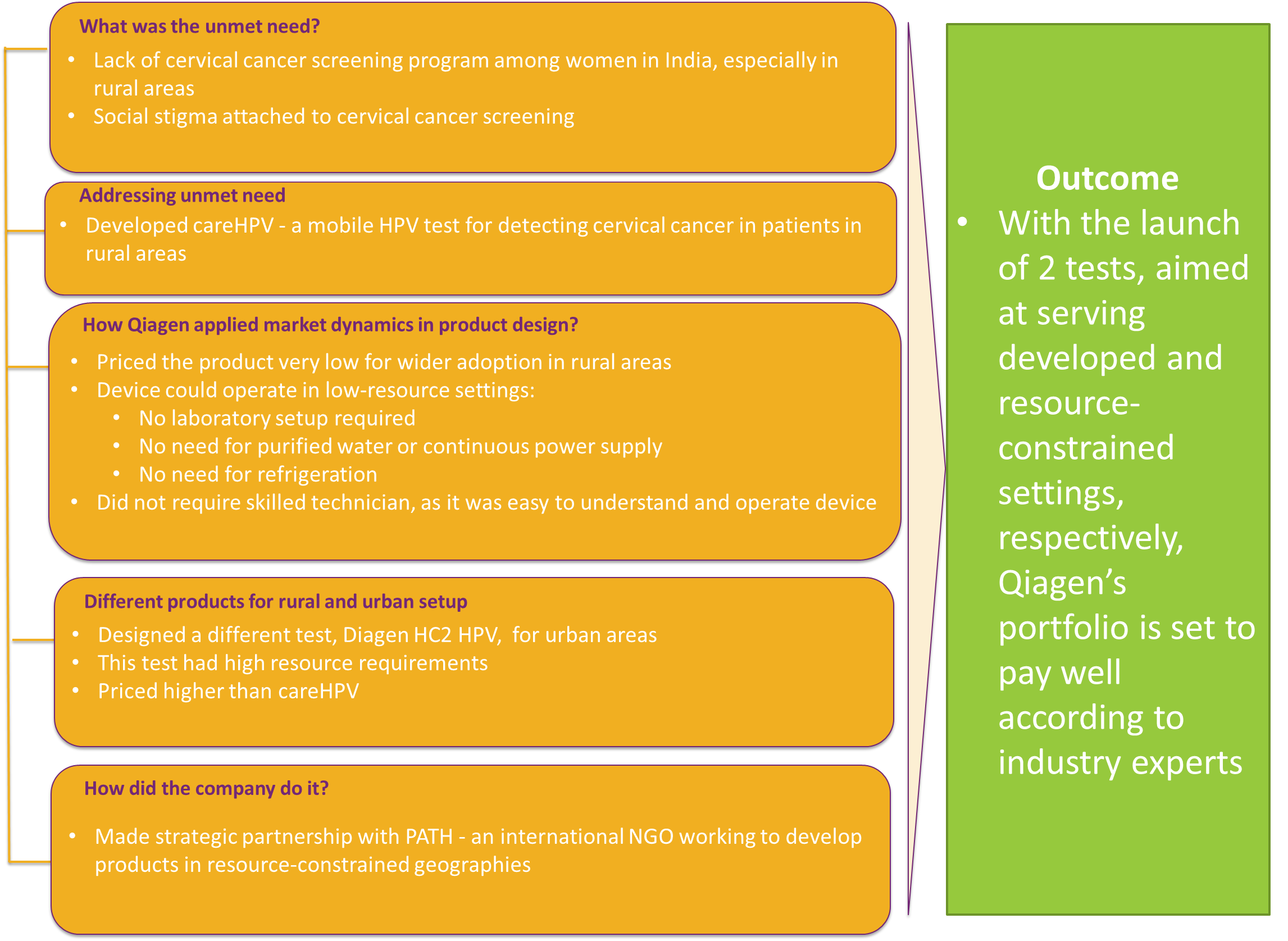As seen in the cases of GE Healthcare, Qiagen, and Abbott, establishing partnerships with other stakeholders for collaborative innovation pays off in the long run, because it gives companies better insight into the market. These stakeholders could be professional bodies, research institutes, local companies with strong footprints in domestic market, or insurance companies.