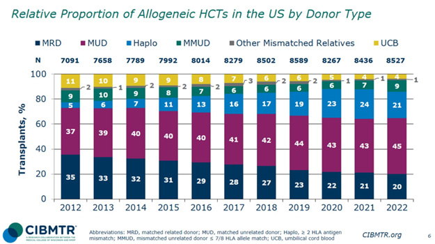 While major research has occurred in MMUD, the current donation landscape in the U.S. shows that the minority of transplants were MMUDs in 2022. According to the CIBMTR, in the U.S., from 2017 to 2022, there was a 66.7% increase in MMUD transplants.10 The majority, 45%, of allogeneic HSCTs in 2022 occurred with MUD; 20% of transplants occurred with haploidentical donors, with MRD at 21% and MMUD at 9%. As research in this field expands and more data supports MMUD, we can expect an increase in MMUD adoption in the future.