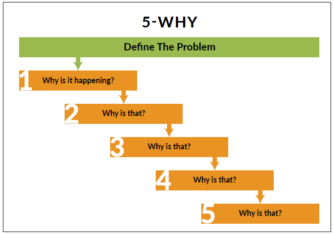 The 5-Why method helps define the root cause of a problem by asking “Why?” In the example of the scratched part, the questioning would start with, “Why was there a scratch on the part?” Each answer is the basis for the next question, as shown in the example above (Figure 3). Starting with the problem, ask why it occurred, until the root of the problem is discovered. Keep in mind there may be multiple causes of a problem. The “Why?” question needs to be repeated for each potential cause.