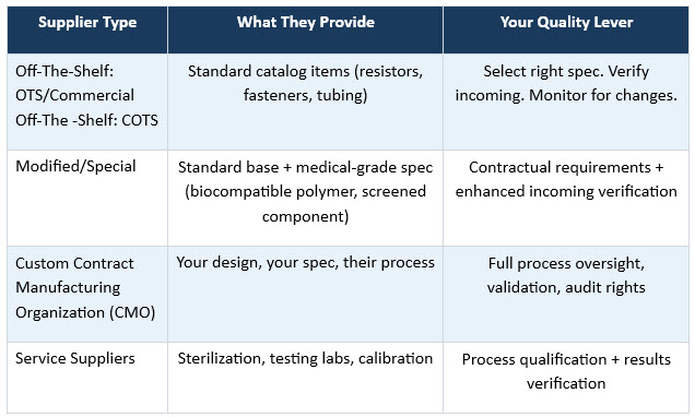 Real-world example: A manufacturer sources a standard transistor for a cardiac monitoring device. The component is OTS; the supplier makes it for dozens of industries. The right quality lever is specification selection (verify it survives device operating conditions), incoming inspection, and a watch on the supplier's product change notifications. Attempting a full ISO 13485 audit of this supplier misallocates resources and creates no real quality benefit. That same audit effort, redirected to the CMO machining your device's titanium enclosure, prevents recalls.
