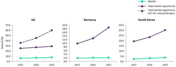 We estimate that the 2017-2018 market values of U.S. patients who would potentially be eligible for prevention, versus rescue therapy, are $25.1M and $10.3M, respectively (shown by pink and grey bars in Fig. 2).