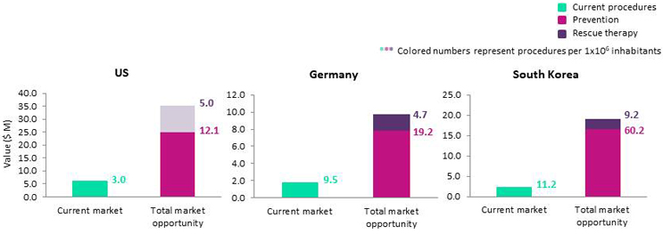Fig. 2 — Current and potential market value of intracranial stenting devices: U.S., Germany, and South Korea, 2017