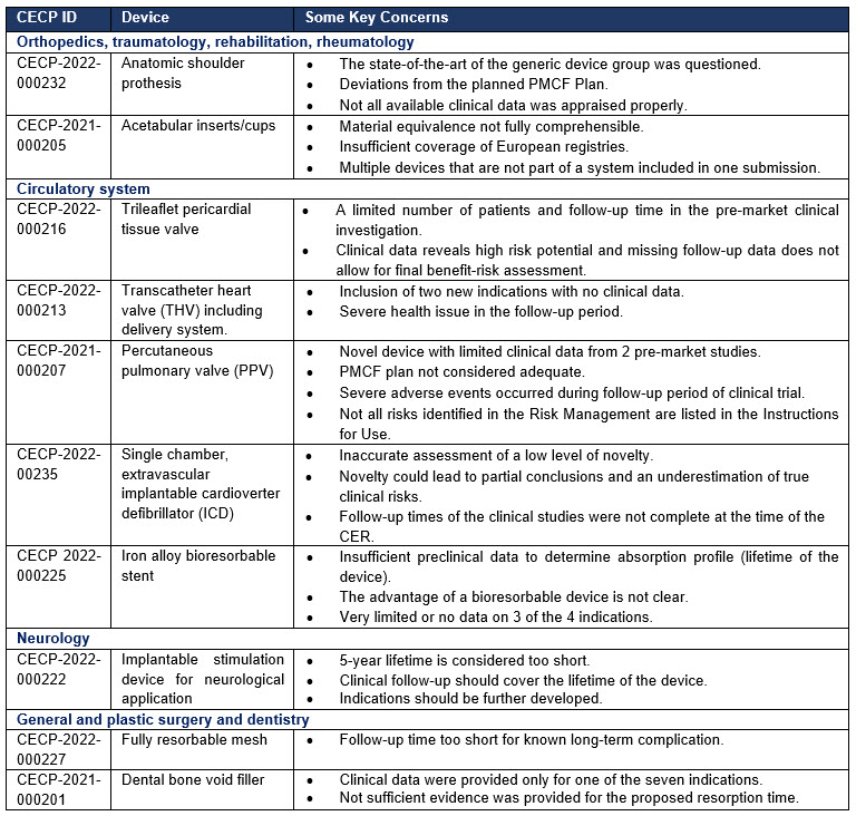 - Concerning the quality of the clinical evidence: The panels identified several methodological flaws and limitations in the submitted clinical investigation reports. In some cases, the Clinical Evaluation Report (CER) and CEAR did not identify and/or assess existing methodological flaws or limitations. As a consequence, the comprehensibility of the provided benefit-risk conclusion was questioned. Additionally, due to unidentified gaps, the PMCF Plans were not fully accepted.