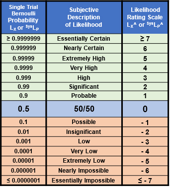 Table A: The range of probabilities from essentially certain to essentially impossible for an event X’s probability of occurrence (LX) and a system’s probability of propagation SysLP. The rating scale LX^ and SysLP^ is also included. The ranges can be extended in either direction as needed. Since there is no certainty, the ratings for LX = 0 or 1 remain undefined.