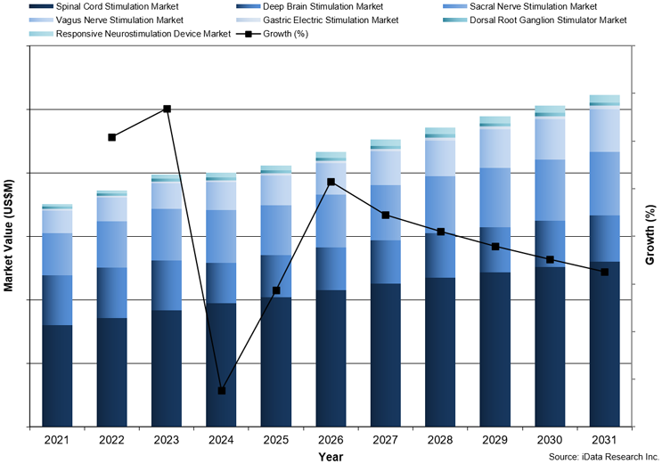 The market for neuromodulation products is expected to grow considerably over the forecast period to reach over $5 billion by 2031. Market growth will be propelled by the wider acceptance of neuromodulation products, allowing them to be used in a larger proportion of potential patients. As new devices are developed and more indications are approved for this technology, the patient population will increase, driving unit sales. Additionally, neuromodulation products require replacement when their batteries become depleted, leading to continuing replacement sales. Many neuromodulation patients require multiple devices over their lifetimes because the battery life of neuromodulation devices is limited, ranging from three to 11 years, depending on the brand and patient usage.