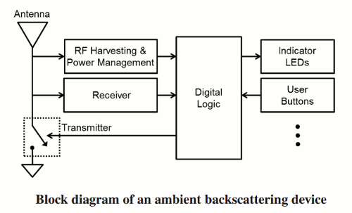 To test their technique, the team developed battery-less, credit card-sized prototype devices. Each incorporated a transmitter, a receiver, and an energy harvester (see block diagram below), and were mounted to an ordinary printed circuit board along with a dipole antenna and an LED light that flashed when a signal was received from another of the devices. The devices were tuned to communicate by using UHF TV signals in a 50-MHz wide frequency band centered at 539 MHz. Groups of the devices were then placed in various indoor and outdoor locations in the Seattle area, at varying distances from a local TV tower.