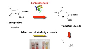 The test is based on the acidification properties generated by the enzymatic hydrolysis of a carbapenem, Imipenem, when it is cleaved by a carbapenemase. The medium acidifies and the acidity (pH) indicator then turns from red to yellow. The detection of this carbapenemase activity can be realised by testing already isolated bacteria or any site infections. The result is obtained in less than 2 hours, while other techniques currently available require a minimum of 24 hours, most frequently 72 hours. The sensitivity and specificity of the CarbAcineto NP test is close to 100%, a value rarely achieved by a diagnostic test in medicine.