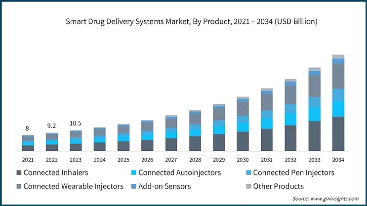 According to the latest report by Global Market Insights, the global smart drug delivery systems market reached $12 billion in 2024 and is expected to grow at a CAGR of 17% from 2025 to 2034. This growth is largely attributed to the rising prevalence of chronic diseases, advancements in wearable drug delivery technologies, and the increasing demand for more targeted and effective therapeutic approaches.
