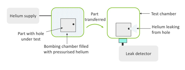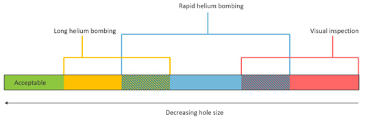 Stage 2: Rapid helium bombing: Use a shorter bombing period, and quickly transfer parts to the detector to minimize loss of helium. This allows identification of defects that are too small to be seen in visual inspection but large enough that they are not detected with the longer helium bombing method. However, the short bombing period means the smallest leaks are not detected.