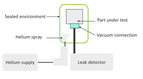 Figure 2: Schematic diagram of helium sniffing process. Helium is sprayed around the part and vacuum pressure draws it through any leak paths and into the leak detector.