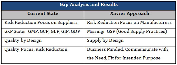 Table 1 details some examples of work that is being done in industry today, versus the gaps being addressed through the Xavier Integrity of Supply initiative. As previously explained, industry is mostly focused on reducing supply chain risk through implementation of supplier controls and oversight. However, the gaps identified by manufacturers pointed to their own organizations, thus indicating the need for risk reduction at the manufacturer. Although there are several GxP’s, an obvious area not addressed is the supply chain. Through the Integrity of Supply initiative, the Xavier team is developing the Good Supply Practices to compliment and complete the remaining GxP’s. Additionally, the pharmaceutical industry has published guidance on Quality by Design for the development of pharmaceutical products through a methodical approach to design of experiments and understanding the design space (variability) of the product. To complement this work, the Xavier team is developing the Supply by Design methodology through the Good Supply Practices to ensure the continued safety and efficacy of product throughout its lifecycle. And finally, industry tends to have concerns about linking quality concepts to business needs, thinking that they are a conflict of interest. However, good quality drives a thriving business, and a successful business is needed in order to continue to serve the patients in need. As a result, the Xavier team has ensured that the solutions are business minded and commensurate with the need.