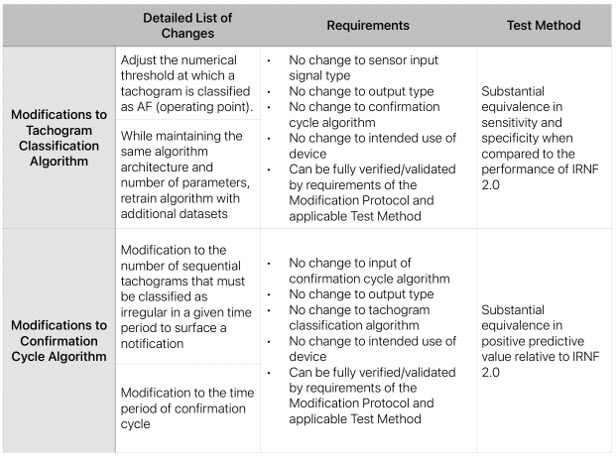 For an example of the power of PCCP, take a look at the following table of approved changes from the 2023 resubmission filing of Apple’s Irregular Rhythm Notification Feature for Apple Watch. Apple can refine its AI algorithm’s ability to detect atrial fibrillation without going through the lengthy resubmission process, resulting in faster, more accurate alerts for users.