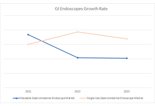 Figure 2: Single-Use Gastrointestinal Endoscopes and Reusable Gastrointestinal Endoscopes Market Value in 2021, 2022 and 2023. Access iData’s U.S. Gastrointestinal Endoscopic Device market report to view more granular data.