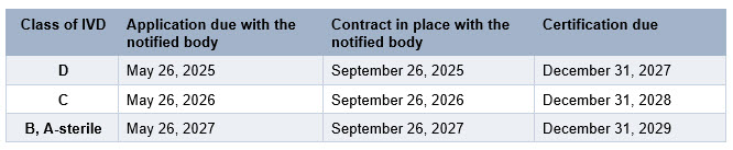 The latest amendment of IVDR by Regulation 2024/1689 identifies new due dates for IVD compliance, as summarized in the table below.