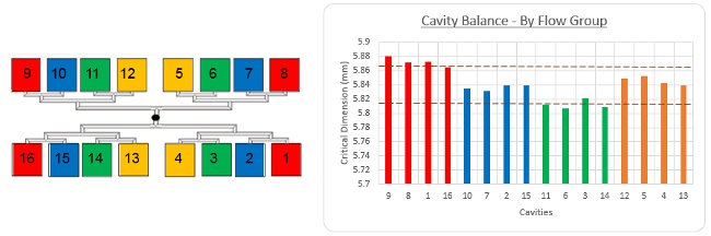 Taking another look at the same data with the shear heating variations concept applied, it can now be seen that the source of the problem is an imbalance due to shear heating variations. Figure 5 shows the same data as Figure 4, only rearranged by color coding according to which cavities receive an equal amount of shear heated plastic. For instance, the four cavities marked as red were fed by flowing laminates with the same shear heated plastic and are therefore expected to be similar to each other. Cavities marked in blue will also be similar to each other but different from the red cavities, due to the different temperature plastic that filled these cavities. The same goes for the cavities marked in green and orange.