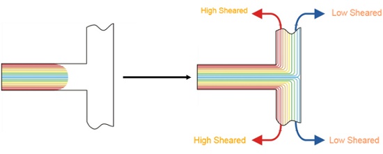This shear heating phenomenon becomes even more interesting when the material arrives at a branch (an intersection) in a runner system. Plastic flows in a laminar manner, which means that it flows with zero turbulence. Due to this fact, it is possible to predict the direction in which various laminates of plastic will travel. When plastic reaches a runner branch, the material splits and will flow in both directions, with the hotter laminates staying to one side of the runner channel, and the cooler ones flowing to the opposite side. Figure 2 illustrates this behavior. Now there is a distinct separation of different temperature plastic from one side of the runner channel to the other.