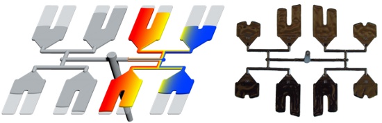 MeltFlipper works in a similar way with multi-cavity molds, except that instead of changing a filling pattern with a single cavity, now the goal is to evenly share the high shear plastic to all cavities. With all cavities filling at the same time and uniform material properties filling each cavity, variations within the parts, mold, and process are minimized.