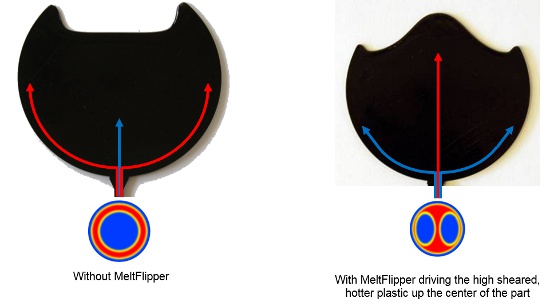 Figure 7 illustrates how MeltFlipper can alter the filling pattern of a single-cavity mold. This example shows the difference in filling pattern on the same mold with and without MeltFlipper technology. Without MeltFlipper, the hotter plastic travels along the side of the cavity, resulting in a gas trap or weld line. For this application, MeltFlipper was designed so that the hotter plastic is driven through the center of the part, effectively changing the filling pattern so there is no chance of a gas trap or weld line. Furthermore, the location of the hotter plastic affects the warpage — the part on the left is expected to warp differently than the part on the right.